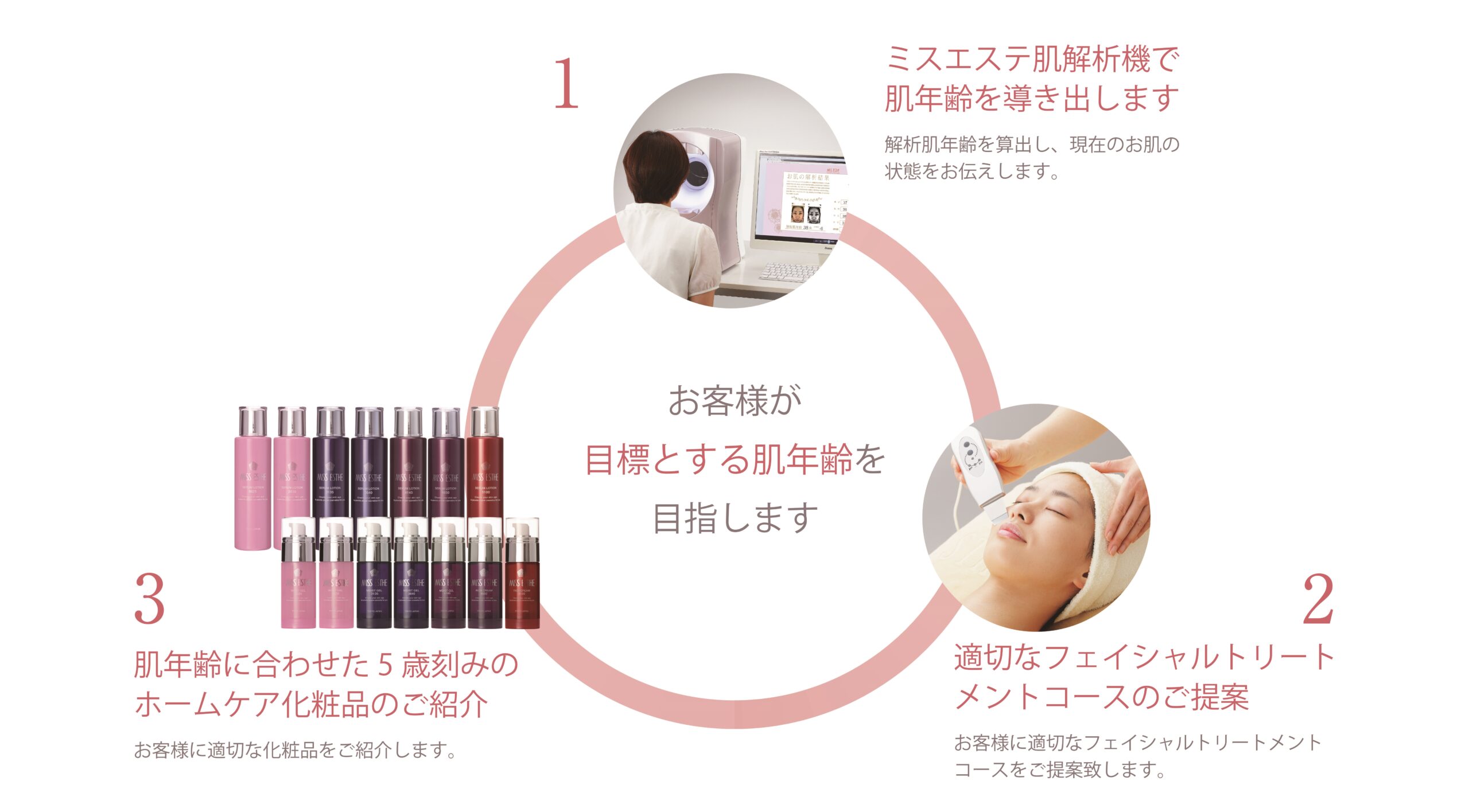 オリジナルの肌解析によりトラブル別の肌年齢と解析肌年齢を導き出し、お客様に最適なフェイシャルトリートメントコースとホームケア化粧品をご紹介する「ミスエステ スキンナビゲーションシステム」。お客様お一人お一人にあわせたお手入れをご提案させていただきます。